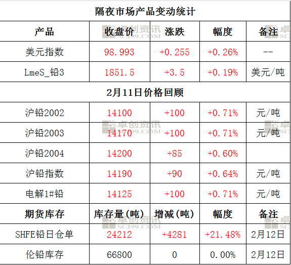 【卓创资讯】2月13日:隔夜美元指数再度上行,盘中一度涨至99.052点高位,刷新近4个月新高。LME有色金属多飘红,但是涨幅均较小,伦铜涨0.66%、伦锡涨0.33%、伦镍涨0.27%、伦铅涨0.19%、伦锌涨0.02%、伦铝跌0.32%。