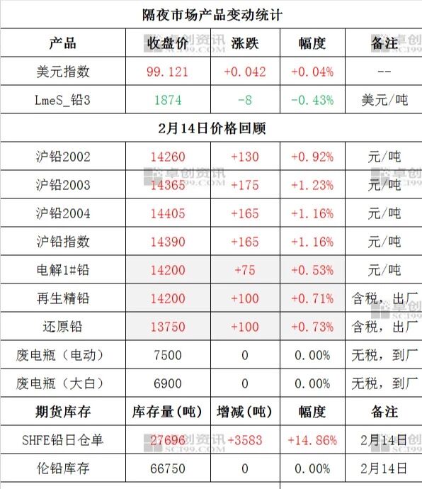 【卓创资讯】2月17日:今日沪铅早盘窄幅调整,截至午间收盘,近月收涨35元/吨至14280元/吨,涨幅0.25%,主力收涨15元/吨至14320元/吨,涨幅0.10%。现货价格小涨,上海1#铅现货最新报价14200-14300元/吨,均价14250元/吨,较前一交易日价格涨50元/吨,涨幅0.35%,较去年同期价格跌2550元/吨,跌幅15.18%。上海市场金沙铅报价14300元/吨,市场报价增多,但下游接货意愿一般,市场成交量不多。